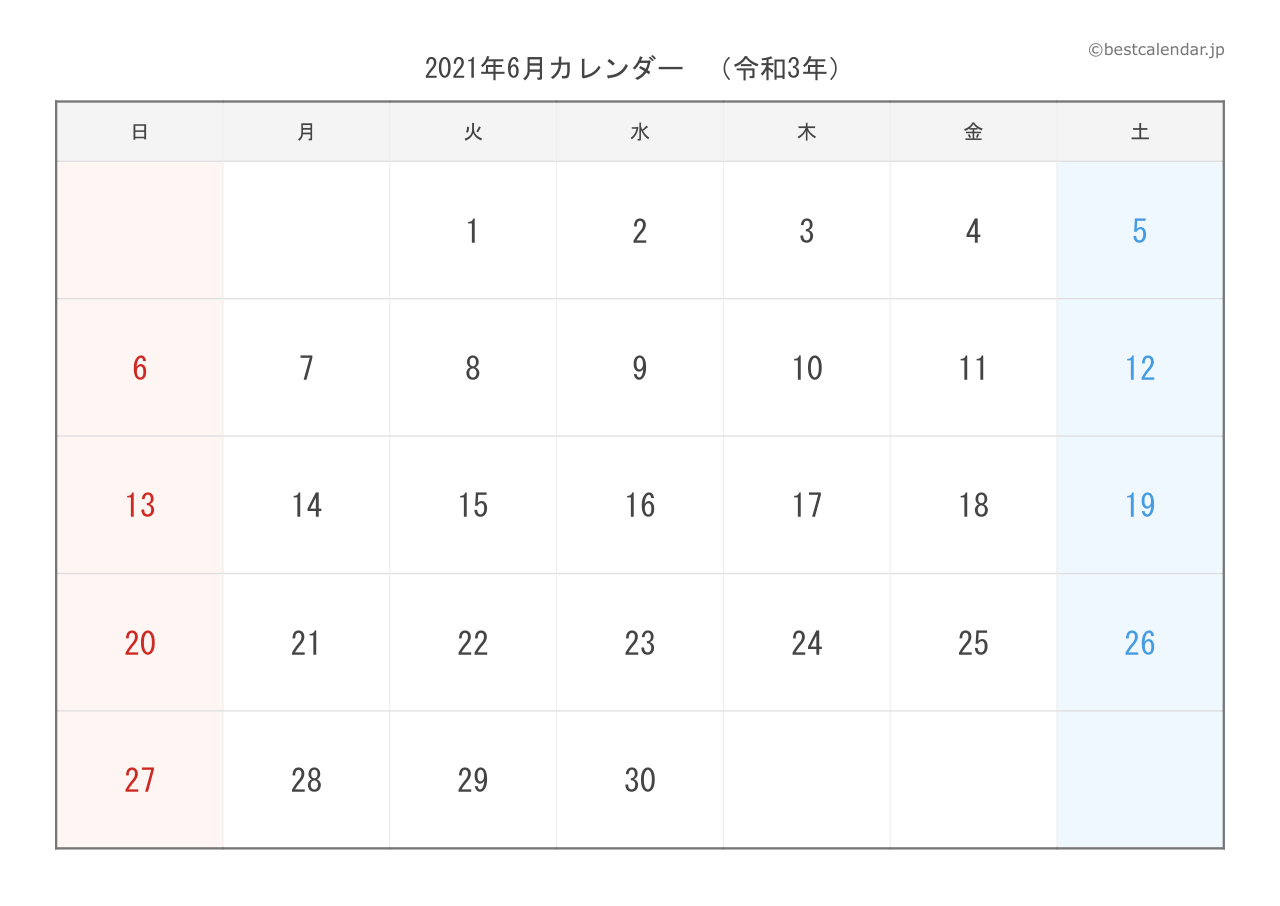 2021年6月のカレンダーです。A4サイズ横向きで印刷に最適化されています。