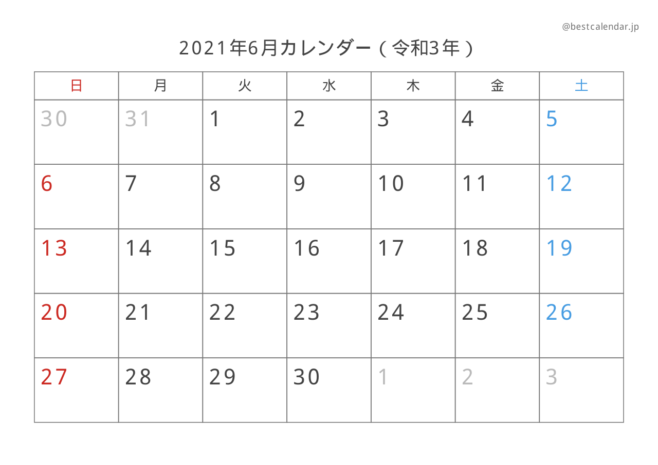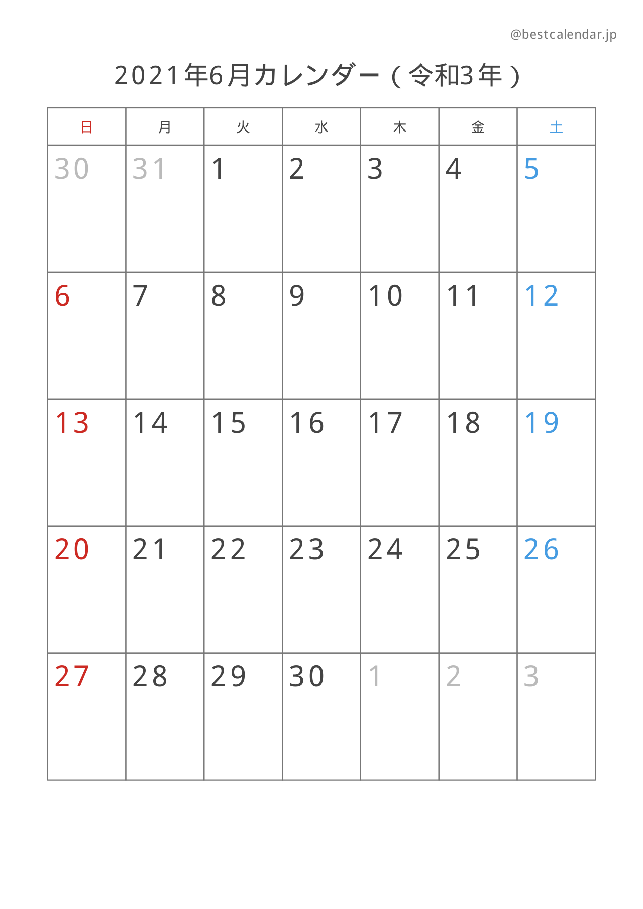 2021年6月のカレンダー(A4縦向き)です。記入重視のレイアウトで設計されています。