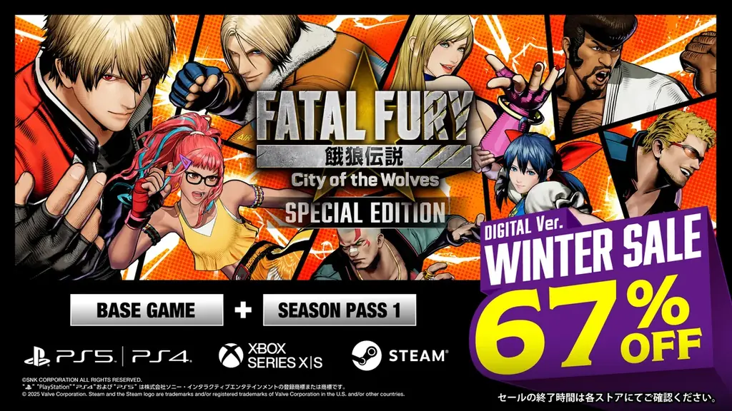 株式会社SNKは、対戦格闘ゲーム『餓狼伝説 City of the Wolves』のSPECIAL EDITION(デジタル版:ゲーム本編+シーズンパス1)を対象に、67%OFFの「WINTER SALE」を開催すると発表しました。本セールは既にSteam版で実施されていたセールに加え、PlayStation®5/PlayStation®4およびXbox Series X|S向けにも対象が拡大される形となります。セールはプラットフォームごとに終了日時が異なりますので、購入を検討する際はご利用のストアでの終了時間を必ずご確認ください。