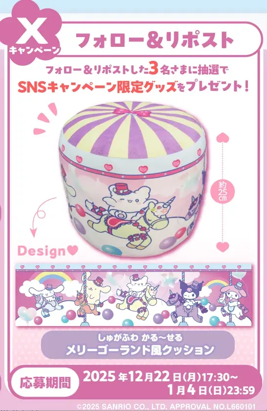 応募期間は2025年12月22日(月)17:30から2026年1月4日(日)23:59までです。抽選で3名に「しゅがふわ かる~せる メリーゴーランド風クッション」が当たります。