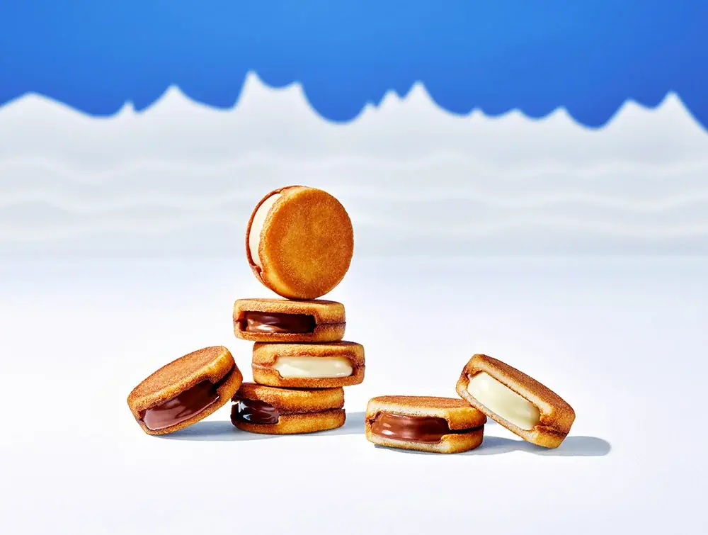 スノーサンドは、2021年のブランド誕生以来、累計販売2,000万枚を突破した主力商品です。北海道の冬の放牧牛乳を使用した濃厚な生チョコレートを、直火でひとつひとつ挟み焼きするラングドシャでサンドしています。ラングドシャの香ばしいカリッとした食感と生チョコレートのなめらかさを同時に味わえる新食感が特徴です。