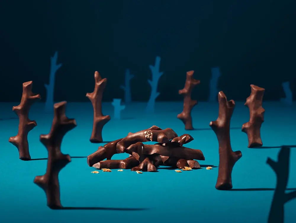 形状は版画家・大谷一良氏の作品「森の見る夢」の木々をモチーフにした3つの形のチョコレートで構成されています。