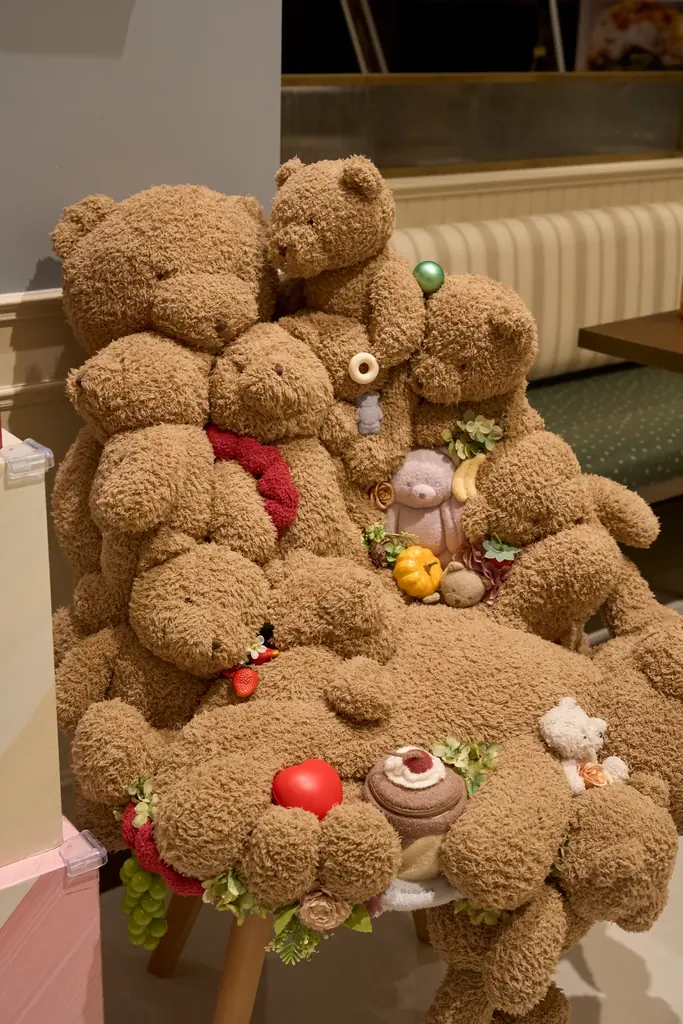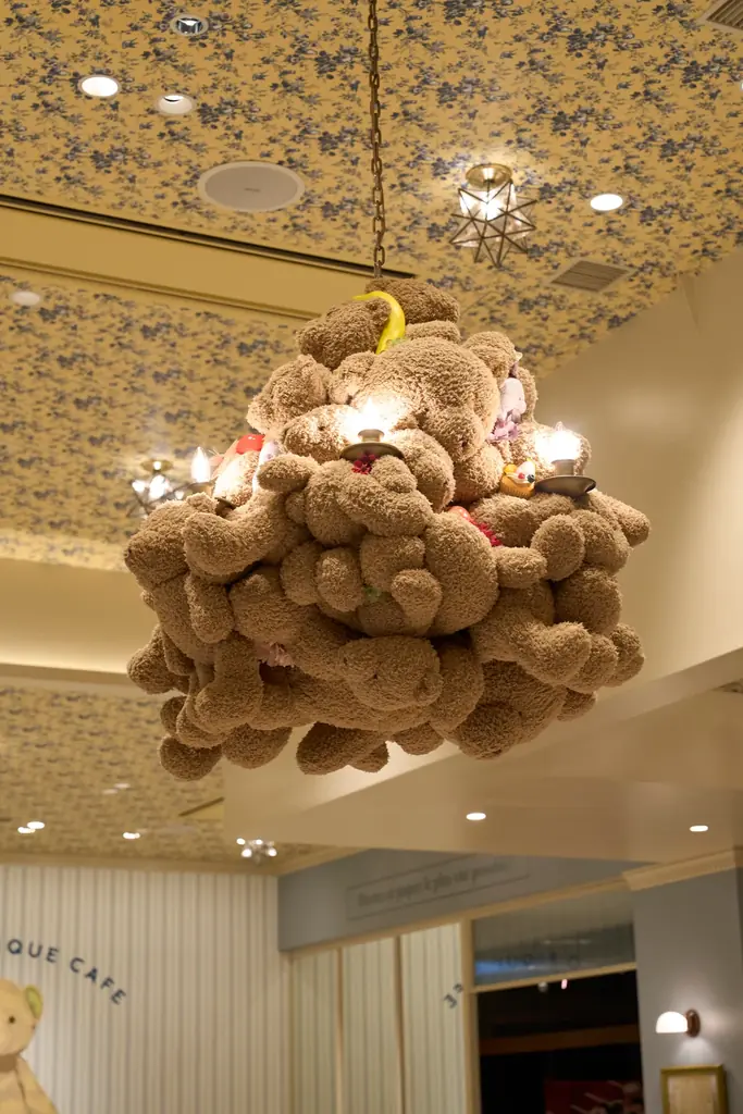 渋谷店のインテリアにはクマモチーフのシャンデリアやチェアを取り入れ、撮影したくなるフォトスポットを多数設置しています。ホリデー装飾として大きなクリスマスツリーを配し、来店者が注文したメニューとともに店内の各所で撮影を行う光景が見られます。