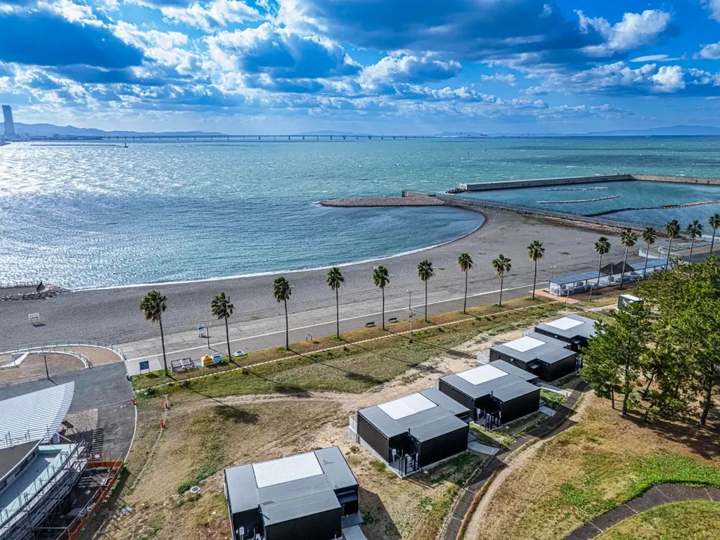 施設は二色の浜公園海浜緑地内にあり、海岸線に面した開放的な立地です。冬季は空気が澄み、夕陽の美しさが際立つため、オーシャンビューを全面に押し出した宿泊体験が可能です。