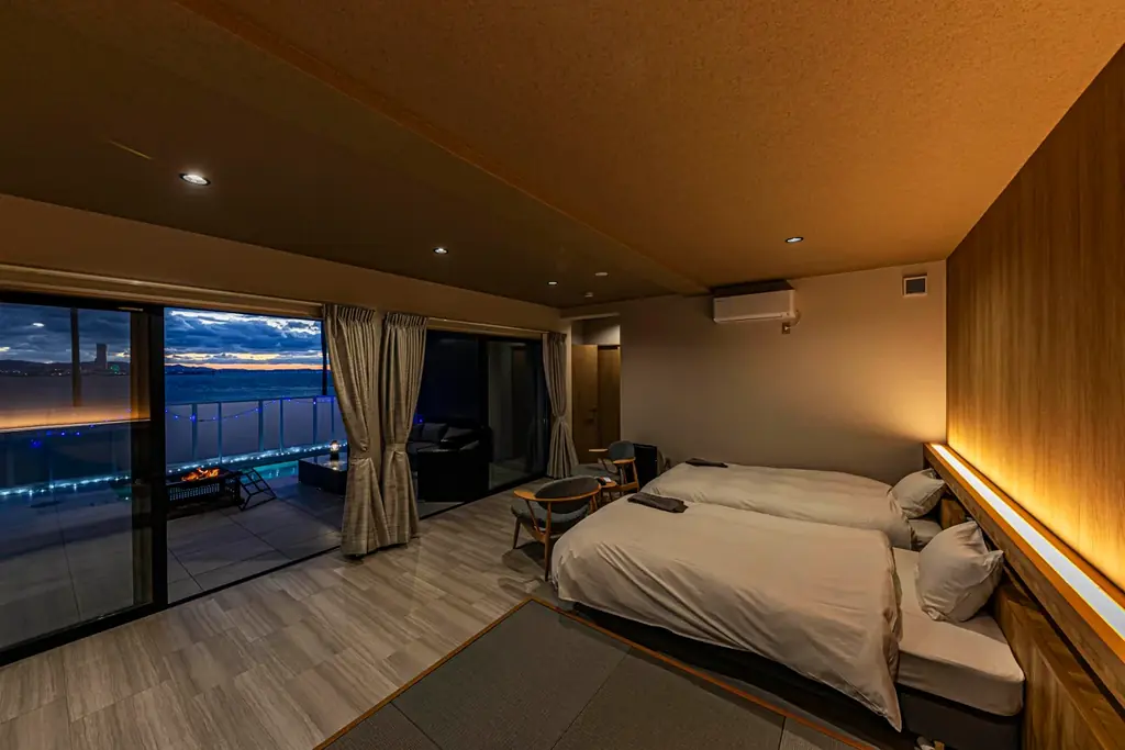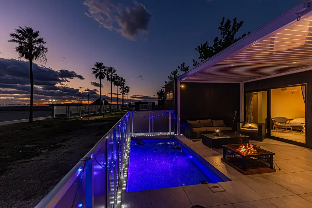 ペット同伴可能な客室は3棟あり、ペットと一緒に滞在できることを明示しています。オーシャンフロントタイプのうち「湊」「凪」の2室では焚き火台が用意され、夜間にはテラスがライトアップされる演出がある点が特徴です。