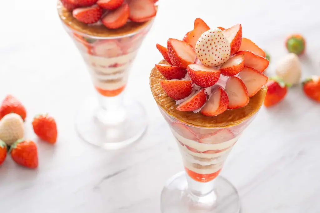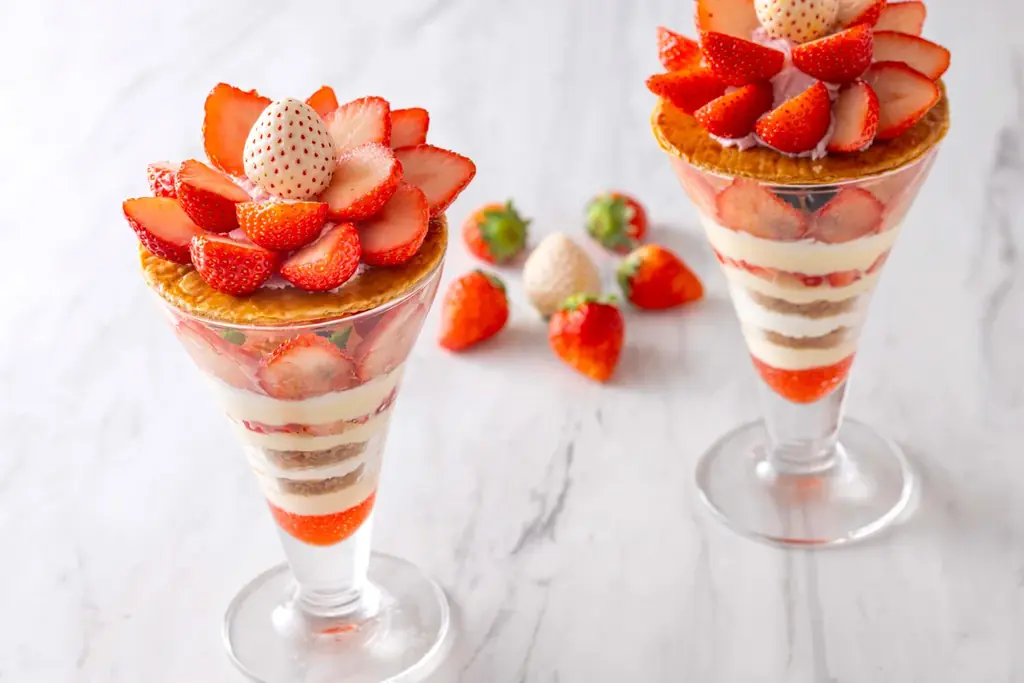 ストロベリーパフェは、赤と白のコントラストを活かした層構造で、ベリーや苺のソース、生クリーム、サクサクのパイ生地と二種の苺をトップに配した一品です。ティータイムやディナー後のデザートに適した提供時間と料金が設定されています。
