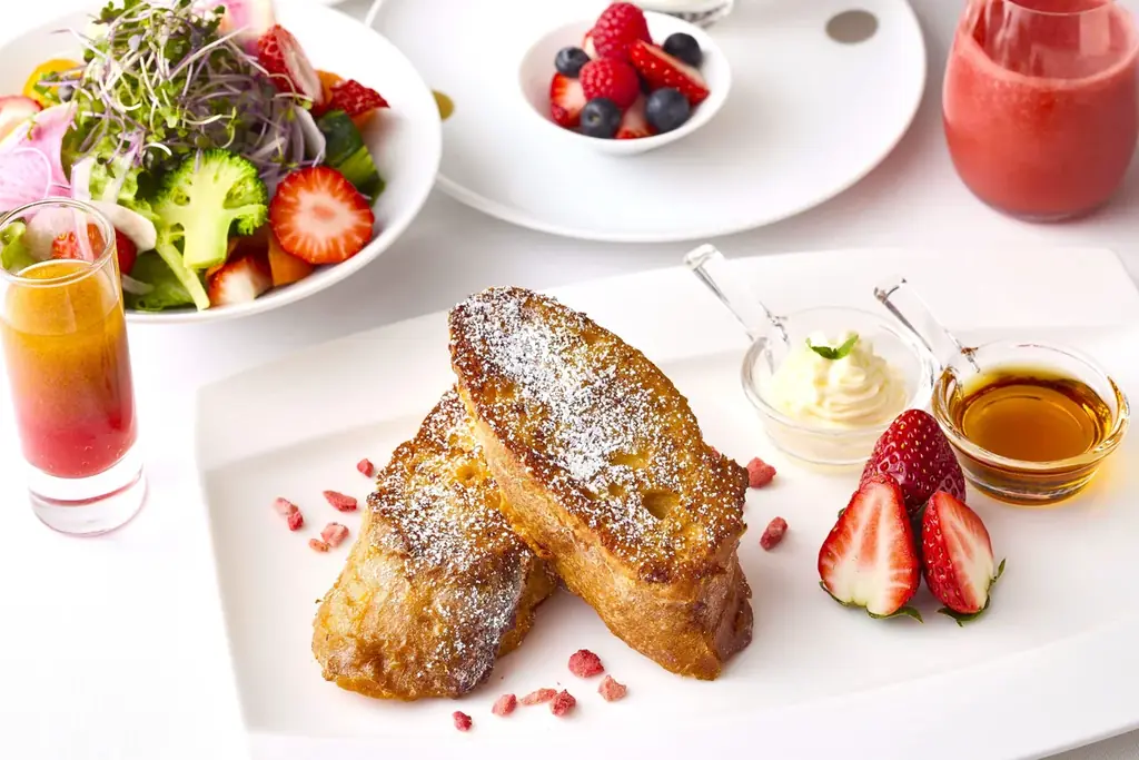 苺を取り入れた朝食(サラダ、フレッシュジュース、フレンチトースト等)をルームサービスで提供するプランです。窓一面の都心景観とともに客室で苺の朝食を楽しめる仕様になっています。