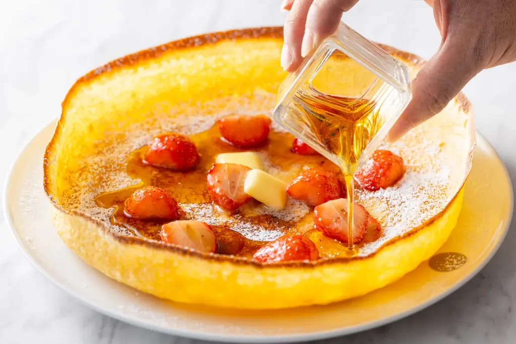 ジャーマンストロベリーパンケーキは、同店のシグネチャーであるジャーマンアップルパンケーキの苺仕立て。薄くもっちり焼き上げた生地にソテーしたフレッシュ苺をたっぷり添え、メープルシロップとバターで仕上げます。