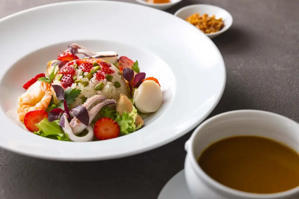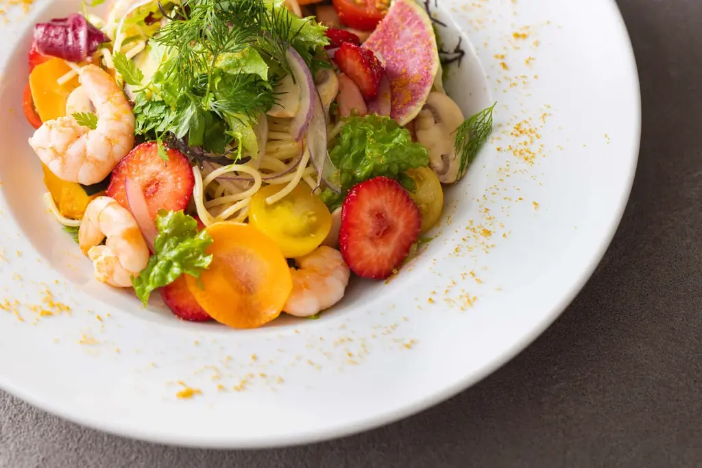 - ・苺と海老のスパゲッティ カラスミの香り または 苺とシーフードの彩りカレーライス