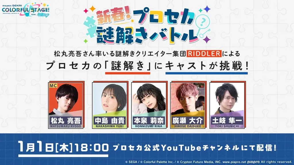 日時:2026年1月1日(木)18:00より、プロセカ公式YouTubeチャンネルにて配信が行われます。番組は松丸亮吾さん率いる謎解きクリエイター集団「RIDDLER」による問題を、声優陣が挑戦する形式です。