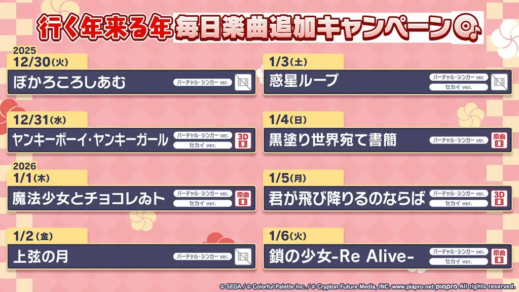 | 行く年来る年毎日楽曲追加 | 2025/12/30〜2026/1/6まで8日間連続で8曲追加(楽曲一覧は本文記載) |