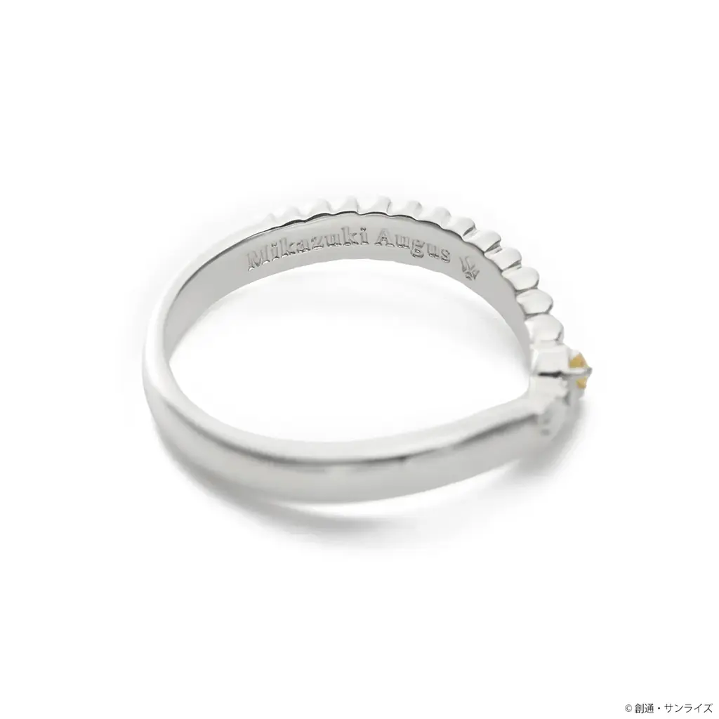 三日月モデルはブレスレットをモチーフにしたV字デザインが特徴です。中央には三日月マークが配され、イメージカラーのストーンがあしらわれています。リング内側には三日月・オーガスの名前と鉄華団マークの刻印が入ります。製品はオリジナルBOX付きで、日本製です。