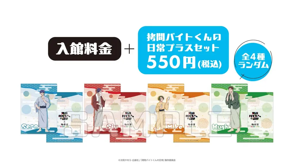 店舗ご入館時に、入館料金と「拷問バイトくんの日常プラスセット」の料金を支払った方を対象に、描き下ろしイラストを使用したコラボ限定クリアファイルをランダムで配布します。配布は来館時の支払いが条件です。