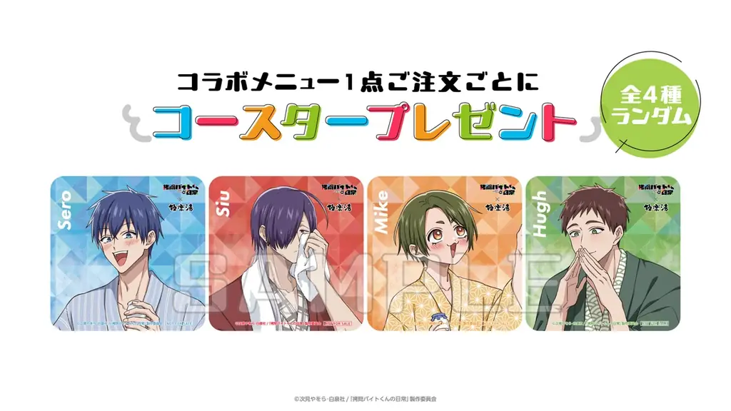 | 主な実施内容 | コラボ限定クリアファイル配布(プラスセット購入時)、コラボグッズ販売(店頭・オンライン)、コラボメニュー(オリジナルコースター配布)、各キャラクターをイメージした4種のコラボ風呂、館内装飾(描き下ろしパネル・のぼり・ポスター) |