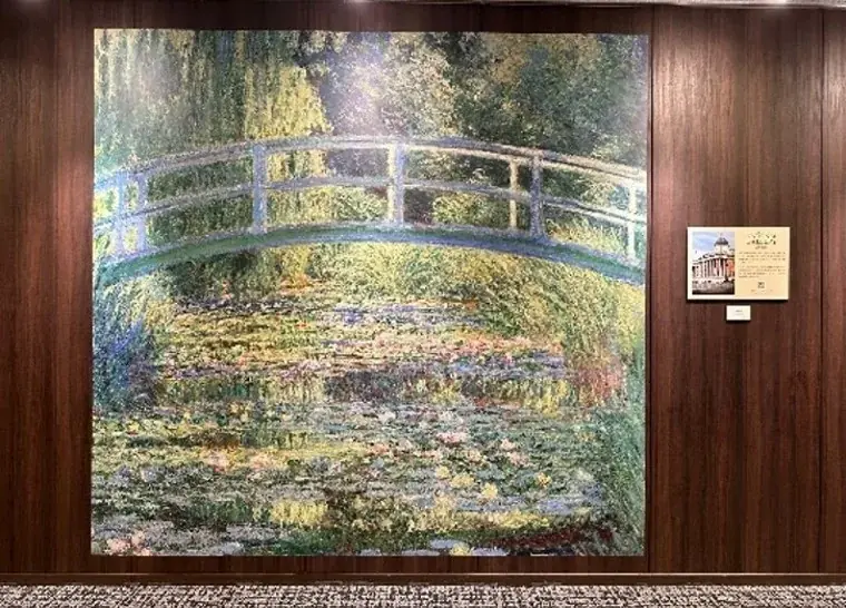ホテル1階では美術館をイメージした名画の複製画提示コーナーを設置するほか、モネの代表作「睡蓮の池」を原寸の約3倍サイズで再現したフォトスポットを用意します。宿泊者はもちろん、来館者が視覚的にモネの世界を楽しめる展示となっています。