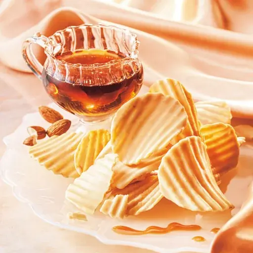 ポテトチップの片面に口どけの良いチョコレートをコーティングした製品で、チョコレートの甘さとポテトの塩味のバランスが特長です。パリッとした食感と濃厚なチョコの組合せが人気となった商品です。
