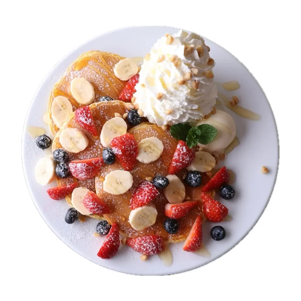 - クア・アイナ(7F):「季節のフルーツパンケーキ」単品1,700円、ドリンクSET2,000円、フライ&ドリンクSET2,150円(税込)—イチゴやバナナ、ブルーベリーを盛り付けたパンケーキ。