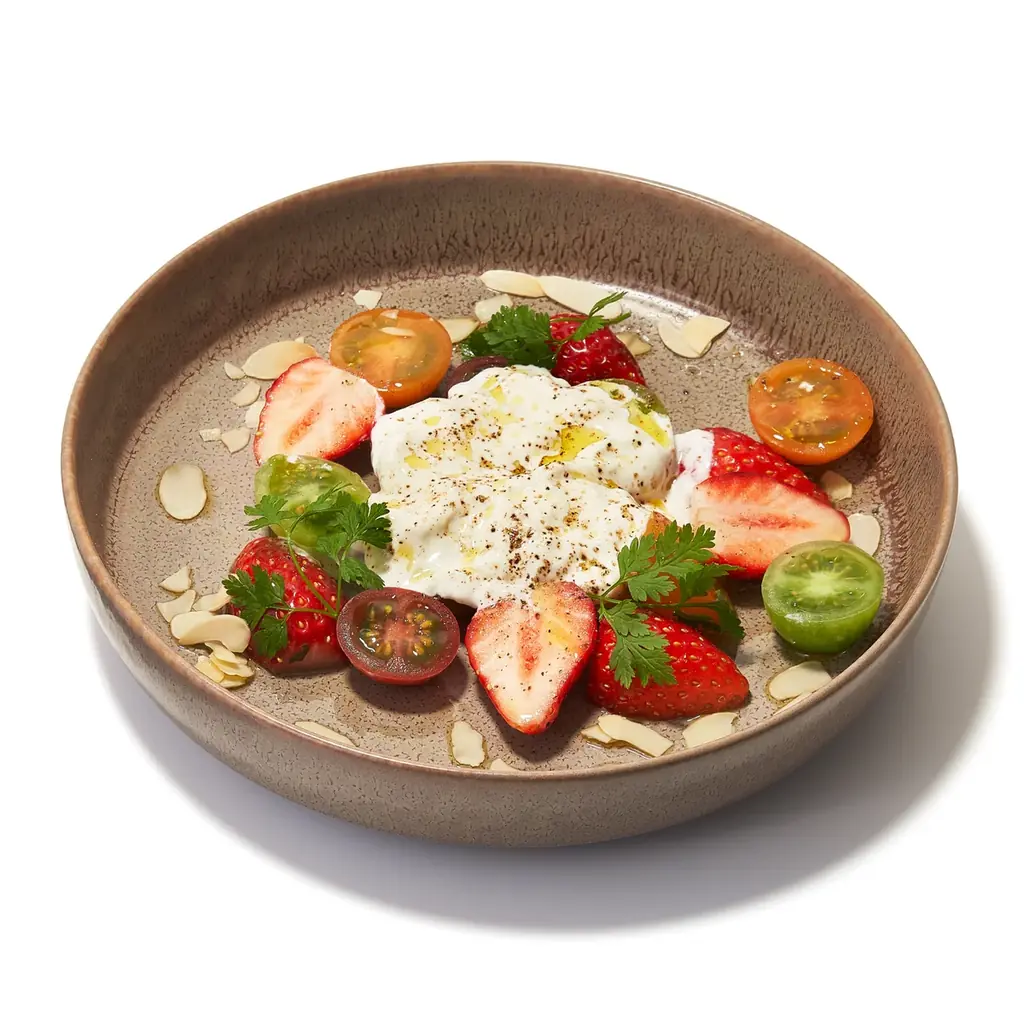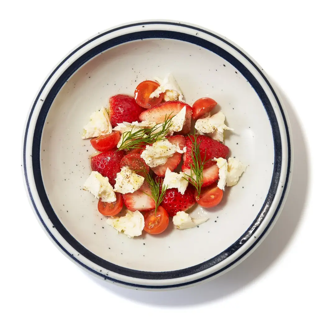 - ガンボ&オイスターバー(8F):「いちごとモッツァレラチーズのサラダ」1,760円(税込)—とちあいかとトマト、モッツァレラの組合せ。