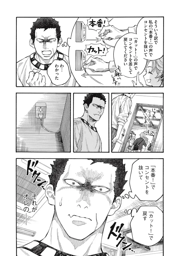 ある日、鯨は偶然出くわした映画撮影現場に巻き込まれ、裏方のピンチヒッターを依頼される。最初に任される仕事は〈コンセントを抜き差しすること〉という一見些細な業務だが、現場での責任の重さ、神経の使い方、タイミングの重要性など、細かな注意点が多く意外と難しいことが第1話で描かれている。