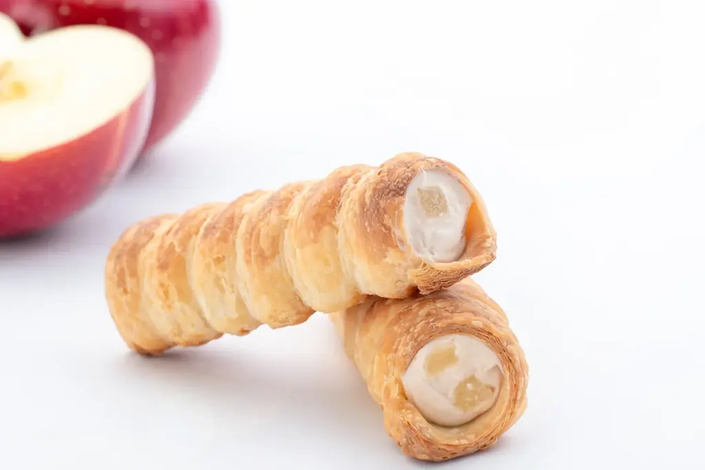 りんごコルネは、白あんベースのクリームにシナモンを効かせ、リンゴのコンポートを混ぜ合わせることで果実の食感と香りを残しています。白あんがクリームのベースに用いられているため、和の緻密さと洋の風味が両立した味わいです。