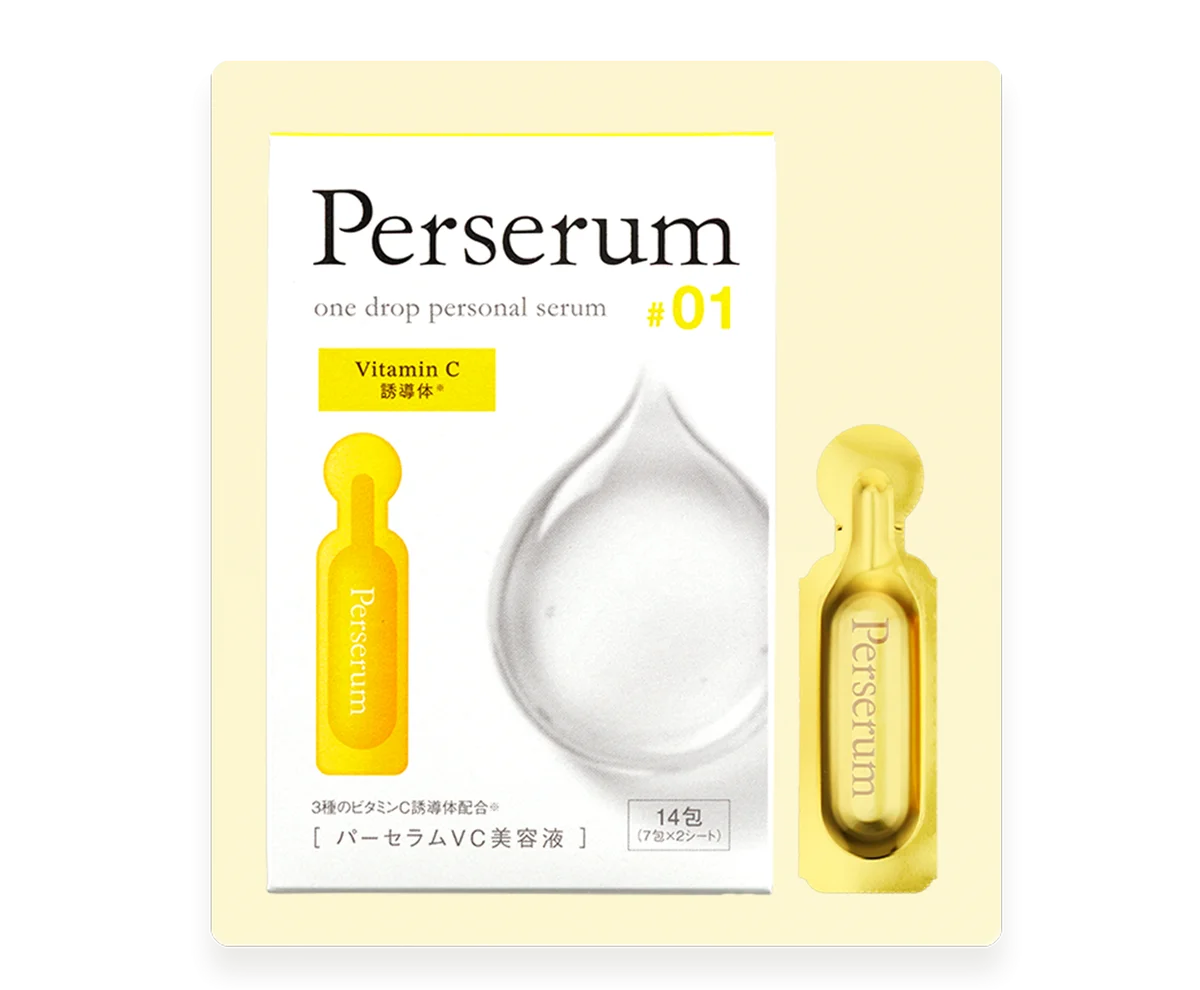 | パーセラムVC美容液 | 3,300円 | 14包(30g) | 3種のビタミンC誘導体(AA-2G、VCエチル、APPS)配合。気密性の高い分包で1回使い切り。サイズ:H120×W80×D25mm。 |