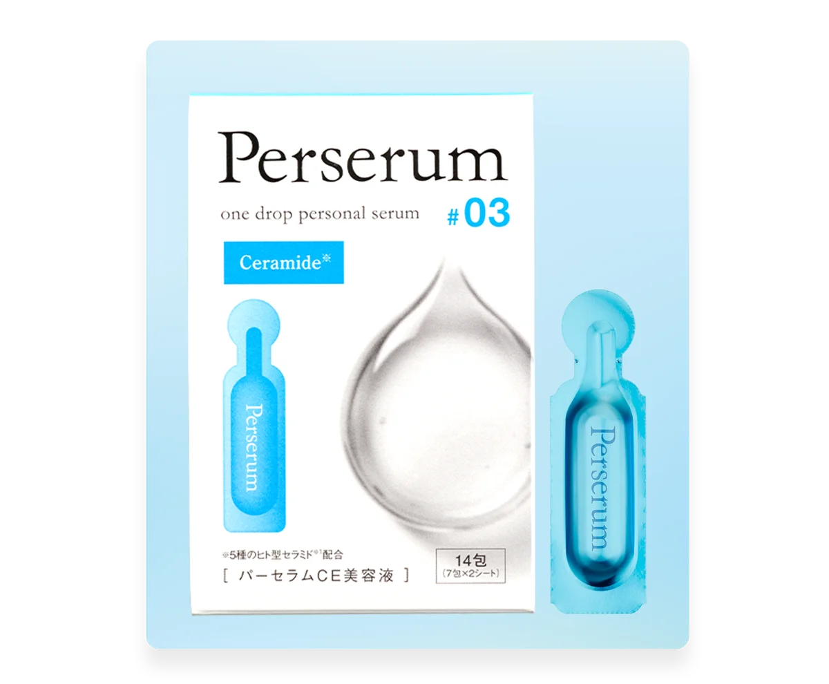 | パーセラムCE美容液 | 3,300円 | 14包(30g) | 5種のヒト型セラミドと3種のセラミド類似成分配合。ナイアシンアミドとビタミンC誘導体でうるおいによる透明感をサポート。分包アルミ包装。 |