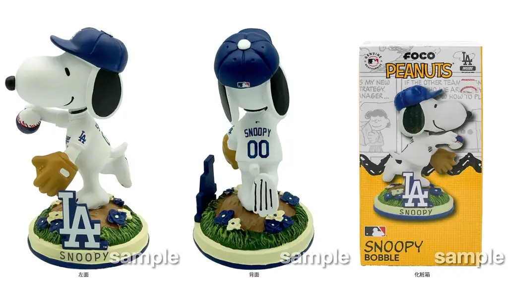 ボブルヘッドはドジャースのユニフォームに身を包んだスヌーピーを立体化し、軽やかなフォームでマウンドに立つ姿が再現されています。PEANUTSの愛らしさとMLBの世界観を融合させたデザインが意図されており、ファン・コレクター双方を意識した外観です。
