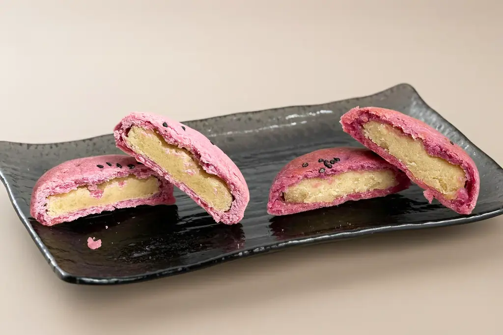 『すい~とパイもん』は鮮やかな紫色のパイ生地で黄金色の芋餡を包み、仕上げに黒ごまをまぶしたビジュアルが特徴です。従来のパイとは一線を画し、生地の中に白く点在する固形のバターを残す製法を採用しています。焼成中にゆっくり溶けるバターから立ち上がる香気成分により、立体的で非常に濃厚なバターの香りを実現しています。