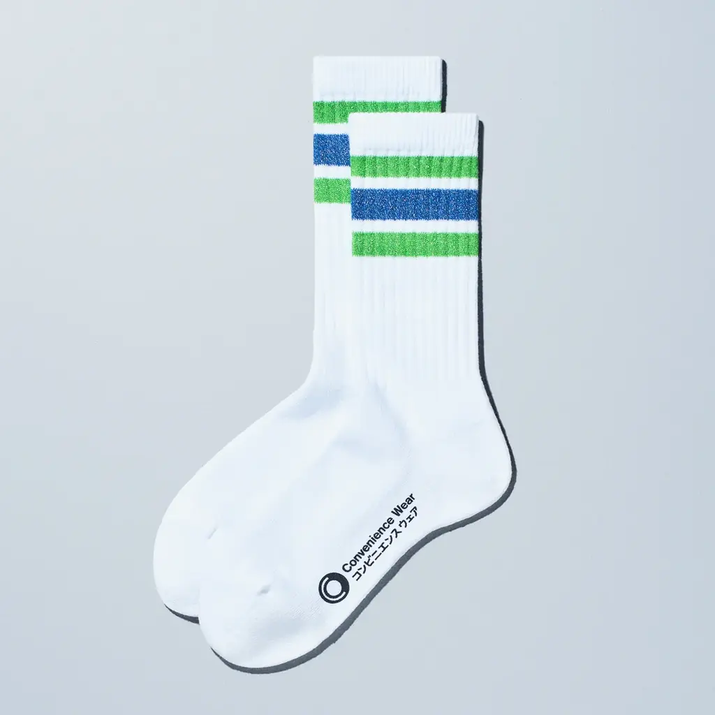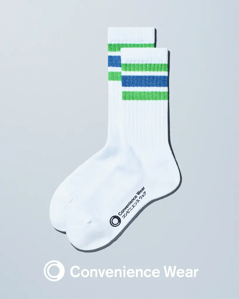 コンビニエンスウェアの2026年福袋では、従来のラインソックスに新たにラメ入り仕様を導入しました。ブランドとしてラインソックスにラメを採用するのは今回が初めてです。カラーは「コンビニホワイト/ラメ」として展開されます。