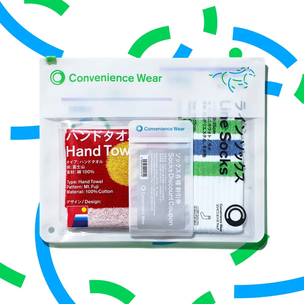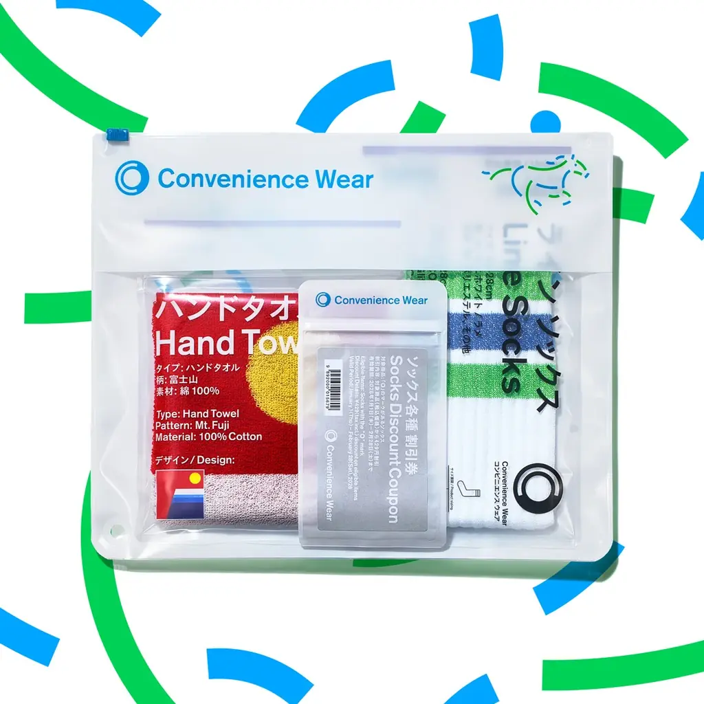- 内容:ハンドタオル(富士山)・ラインソックス(コンビニホワイト/ラメ)・ソックス各種割引券(429円相当)