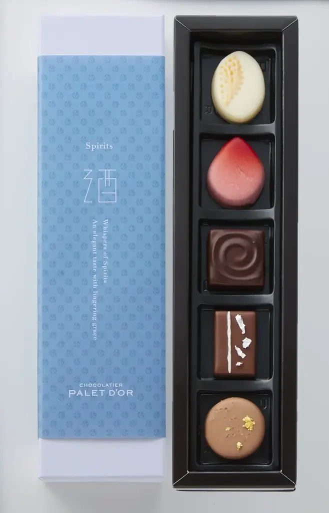「日本のおいしさ『酒(さけ)』」は、焼酎・ワイン・ウイスキー・日本酒・梅酒の5種を詰め合わせたコレクションで、各酒の個性に合わせた自家製チョコレートとの組合せが特徴である。こちらも5個入り、税込4,320円(本体4,000円)で販売される。