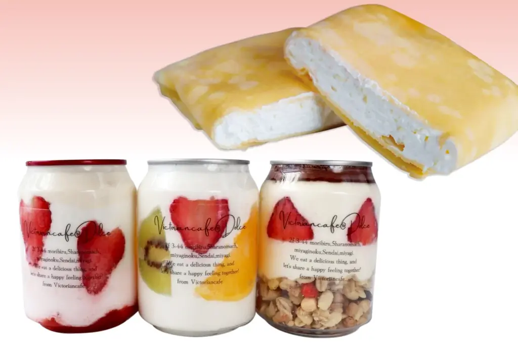- 宮城 / ヴィクトリアンカフェ — 白雪姫パフェケーキ缶(250ml・1個)税込 990円、蔵王牛乳クレープ(1個)税込 450円。フルーツたっぷりのケーキ缶と蔵王牛乳使用のクレープ10種を展開。