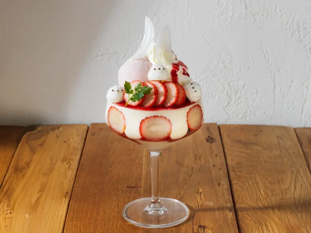 このパルフェは複数の層を重ねることで、味わいの変化と食感のアクセントを持たせています。グラスの中身はバニラシフォン、練乳ミルクプリン、練乳カスタード、苺の果肉、ベリーアイスなどが順に重ねられており、食べ進めるごとに異なる風味が楽しめる設計です。