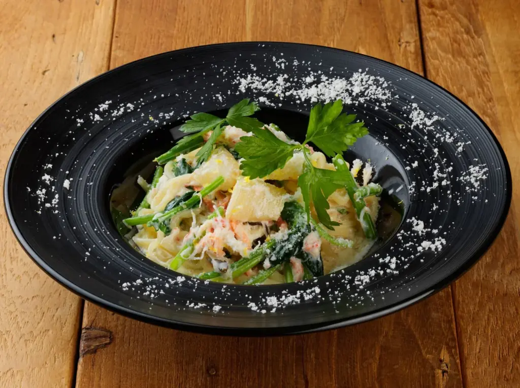 小樽産の数の子と紅ズワイガニをふんだんに使用したクリームパスタです。数の子のつぶつぶとした食感と、紅ズワイガニの濃厚な旨みを活かし、塩昆布で和の深みを添え、レモンの香りが爽やかさをもたらすソースでまとめています。