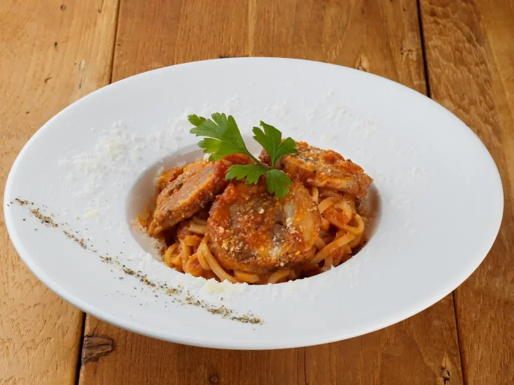 鶏肉の旨みを閉じ込めた自家製ガランティーヌをトッピングしたトマトベースのパスタです。トマトの酸味とバジル、ブラックペッパーのスパイスが大人の味わいを作り出します。