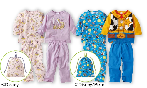 お馴染みのキャラクターをモチーフにしたパジャマセットがベビーとキッズ向けに用意されています。長袖パジャマが2着と巾着袋がセットになっており、ギフトにも使いやすい仕様です。