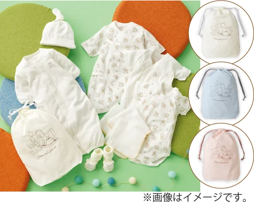 | はじめての出産準備セット | 短肌着、コンビ肌着、ロンパース、ドレスオール、帽子、ソックス、ガーゼハンカチ×3、巾着 | 50〜60cm | 5,500円 | 綿100%、外縫い仕様、ドレスオール2WAY、日本製 |
