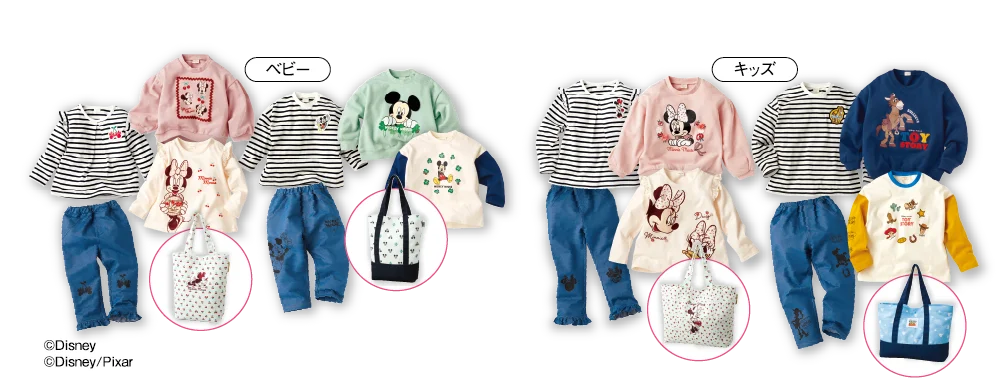 | ディズニー コーディネートセット | トレーナー、長袖Tシャツ×2、ボトムス、トートバッグ | 80〜95cm(ベビー)/100〜120cm(キッズ) | 5,500円 | キャラクター商品 |