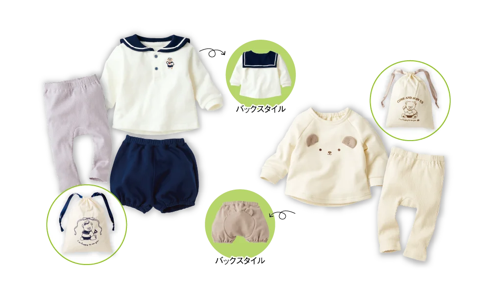 - 長袖パジャマ×2、巾着袋×1/サイズ:ベビー(80・90・95cm)/価格:各3,000円(税込3,300円)