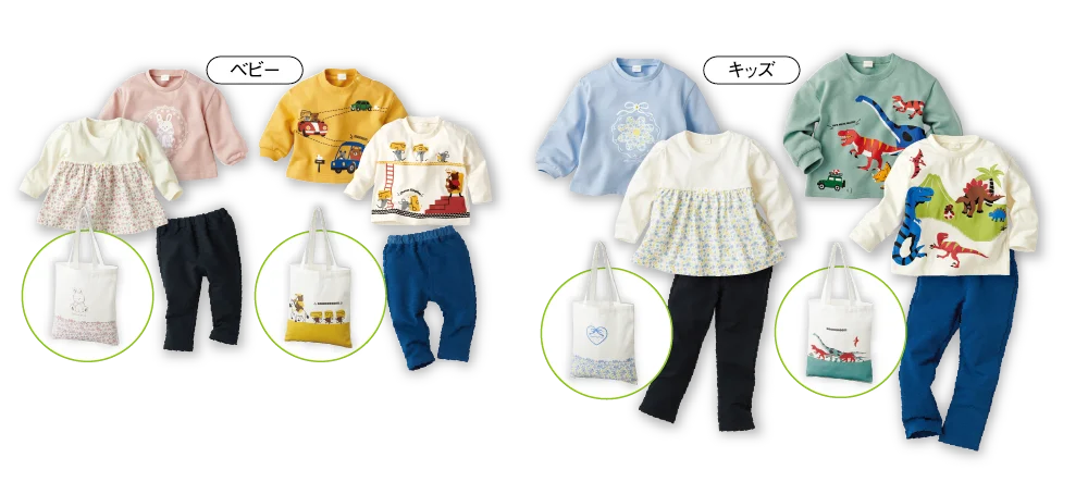 人気キャラクターを用いたアイテムや、赤ちゃん本舗のオリジナルブランド「SiMPLE FREE」によるセットがラインナップされています。いずれもトレーナーやTシャツ、ボトムス、バッグ類が含まれ、外出時のコーディネートを簡単に作れる構成です。