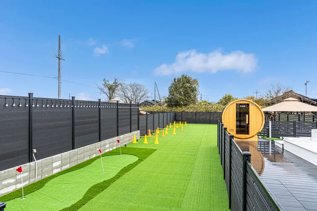 各棟にプライベートドッグランが付帯します。周囲を気にせずリードを外して遊ばせられる広さを確保しており、安全面にも配慮された設計です。自然に囲まれたフィールドで犬が自由に動ける環境は、滞在の重要な要素として強調されています。