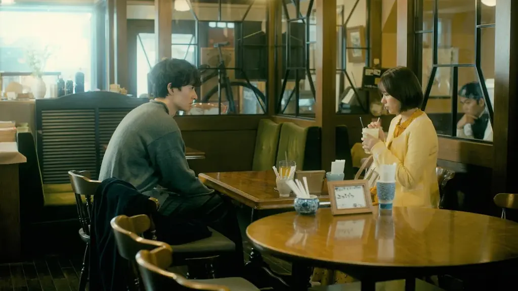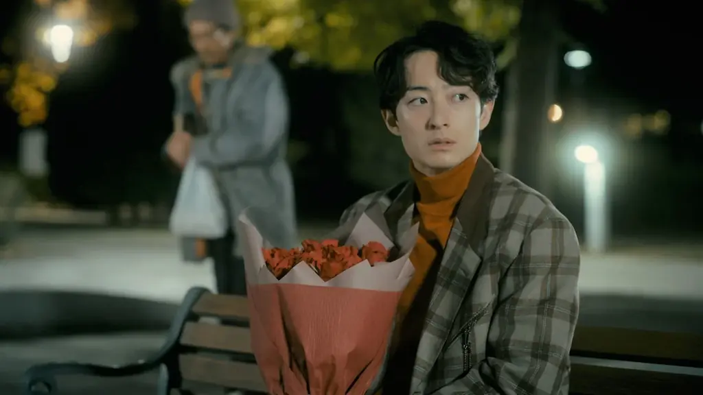 大きめの花束を持った田代(濱正悟)がベンチに座って誰かを待っている。そこに現れた成田(夙川アトム)は訝しげに田代を見ながら同じベンチに座り、たこ焼きを食べ始める。場面写真は第1話より2点が公開されている。