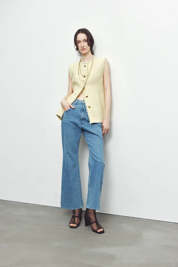 フレアデニムを中心とした着こなし提案。ジレやアクセサリーの合わせ方で、よりフェミニンな印象に寄せることができます。