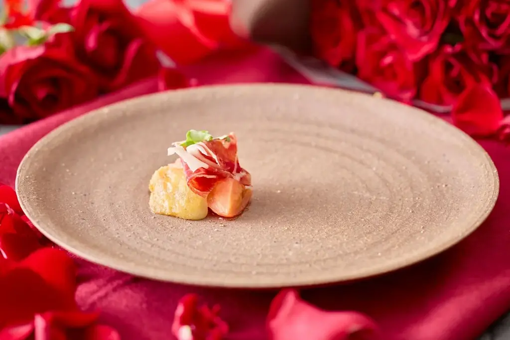 - おもてなしの一品:北海道産フルーツトマトのフランベ、イベリコ・ベジョータの生ハムとカチョカヴァッロにアカシアハチミツ