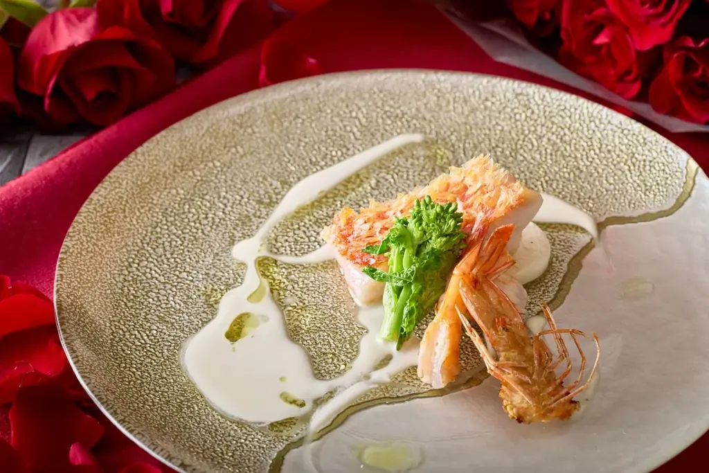 - 魚料理:静岡県産 金目鯛の鱗焼き、天使海老のグリル、海老の頭を香ばしく仕上げたせんべい、ヴェルモットソースと柚子の香り