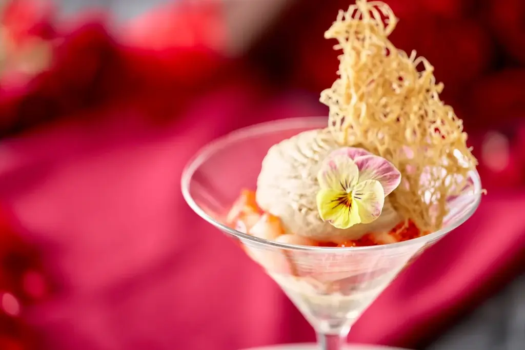 - デザート:ほうじ茶チャイティーをイメージしたデザート(国産苺、苺アイス、ほうじ茶エスプーマ、スパイス香るジュレ、カダイフ)
