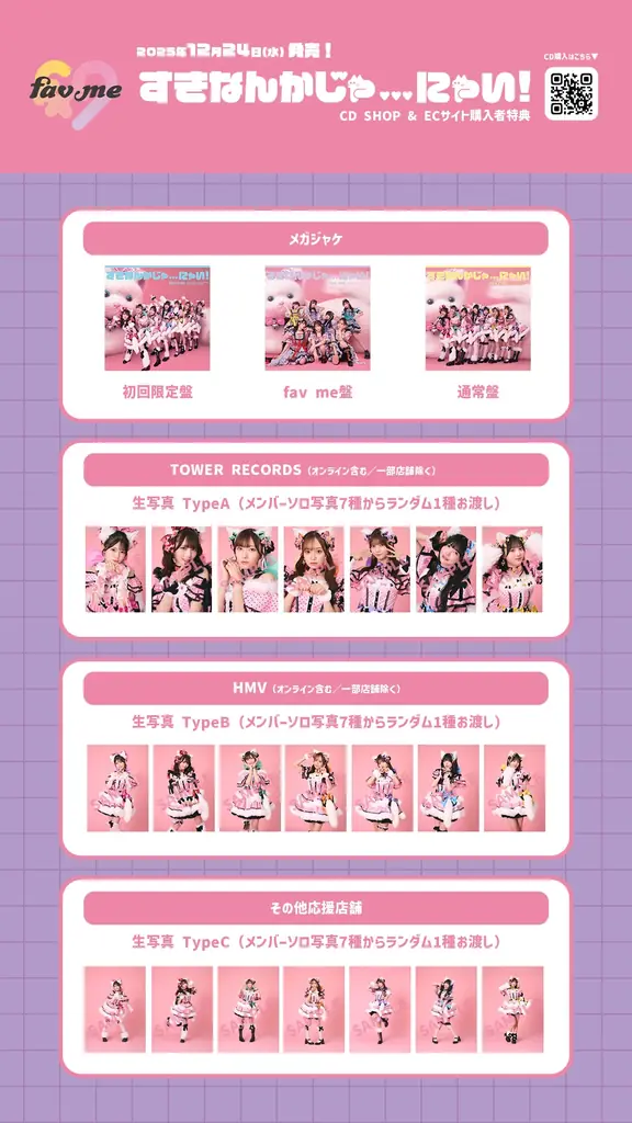 アソビシステム株式会社発表の通り、アイドルグループfav meの1stシングルCD『すきなんかじゃ…にゃい!』が2025年12月24日(水)に発売された。発表日時は2025年12月24日12時00分で、CDは初回限定盤、fav me盤、通常盤の3形態で展開される。