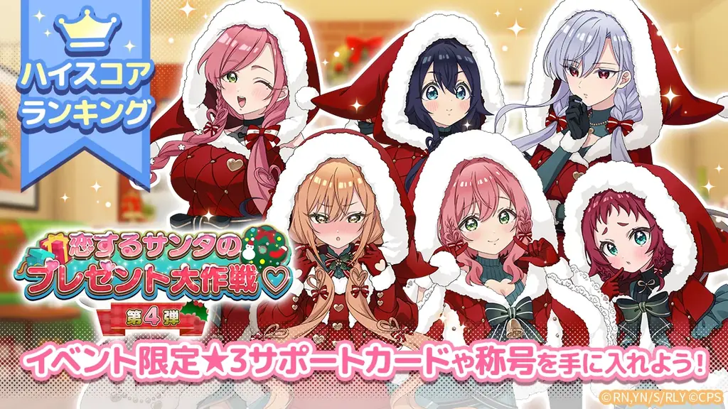 同日12月25日(木)より、イベント「恋するサンタのプレゼント大作戦♡ 第4弾」を開催します。本イベントはイベントマップを周回してポイントを集める形式で、集めたポイントに応じて報酬が得られます。ポイントで獲得できる目玉にはイベント限定の★3サポートカードや、ピックアップガチャチケットなどが含まれます。