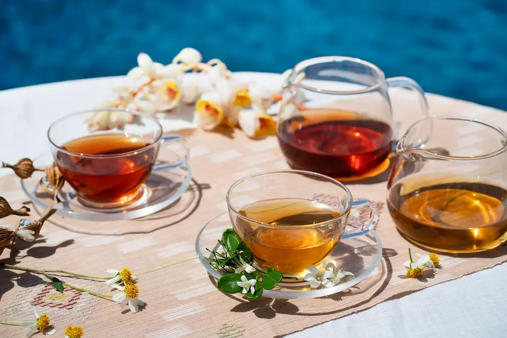 また、ティースタンドには琉球の彫刻や意匠が取り入れられており、王朝時代に使われた「牡丹」や「オナガドリ」といった彫りが施されたデザインに触れることができます。これにより、目にも文化の流れが伝わる演出がなされています。