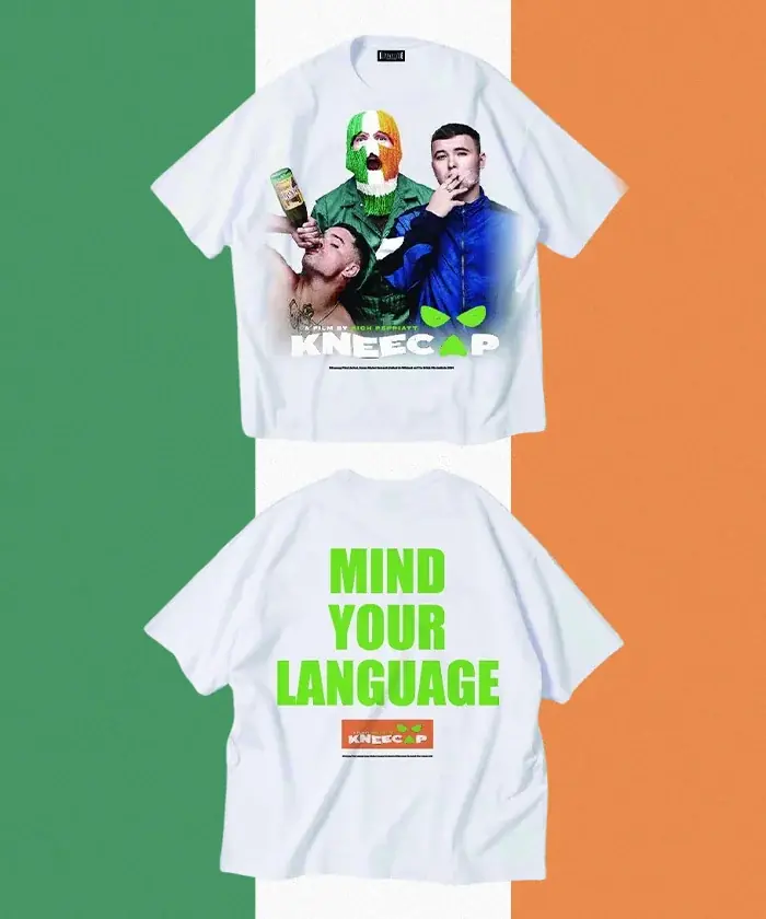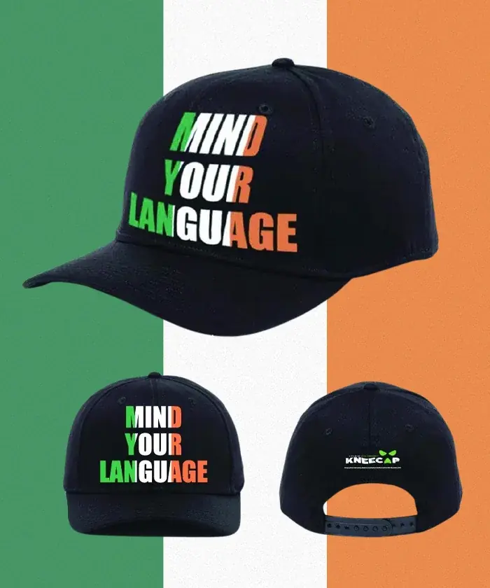 デザイン: フロントに「MIND YOUR LANGUAGE」をアイルランド国旗のカラーで表記し、バックにKNEECAPのロゴを配置したキャップ。